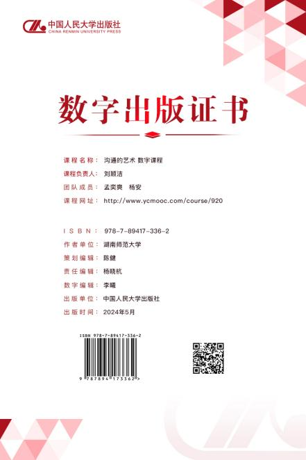 为落实教育部关于国家教育数字化战略行动的要求,我院积极进行优质教学资源的数字化建设,目前国家级线上一流课程《从创意到创业》和《沟通的艺术》2门课程已经获得中国人民大学出版社的数字出版证书,标志着该课程作为电子出版物正式发行,其国际标准书号分别为978-7-89417-337-9和978-7-89417-336-2。