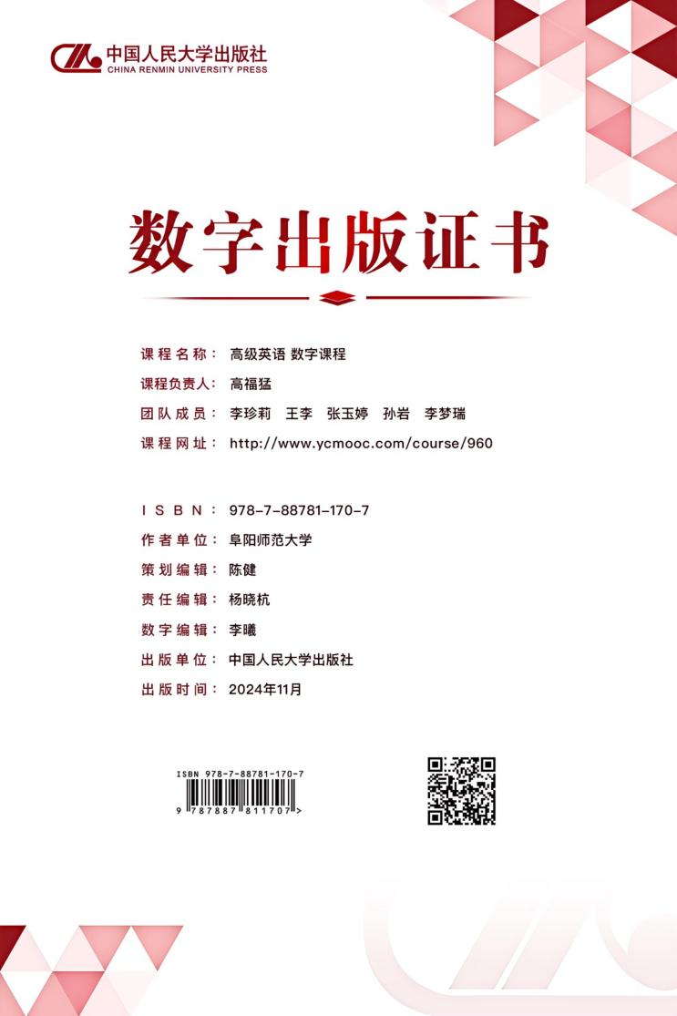 近日,外国语学院高福猛团队《高级英语》数字课程由中国人民大学出版社正式出版上线,实现了我院数字课程出版形式零的突破。