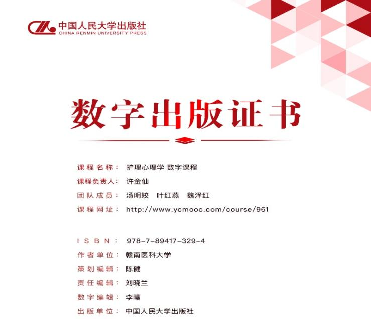 近日,我院护理心理学数字课程由中国人民大学出版社正式出版上线,实现了我院数字出版形式新的突破。